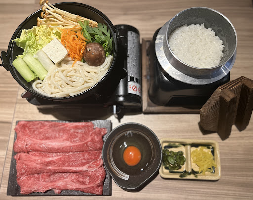 (Translated by Google) Umeda's sukiyaki is a hidden gem! The broth is sweet and flavorful, and the meat is incredibly fresh. I also have to praise their sushi. The rice is yellowish, probably because it's marinated, and it's soft and chewy. The sushi toppings are generous, and it's delicious! 😋 The complimentary braised beef tendon appetizer was also very good. I highly recommend this place; I had a very satisfying meal! (Original) 梅田宝藏寿喜锅,锅底鲜甜,肉质新鲜。 也要夸一下他家寿司, 大米偏黄色应该是腌制过的, 米饭柔软Q弹, 上面的寿司用料特别舍得,很好吃!😋 送的前菜炖牛筋也很好吃~ 很推荐来这家,吃的很满足~